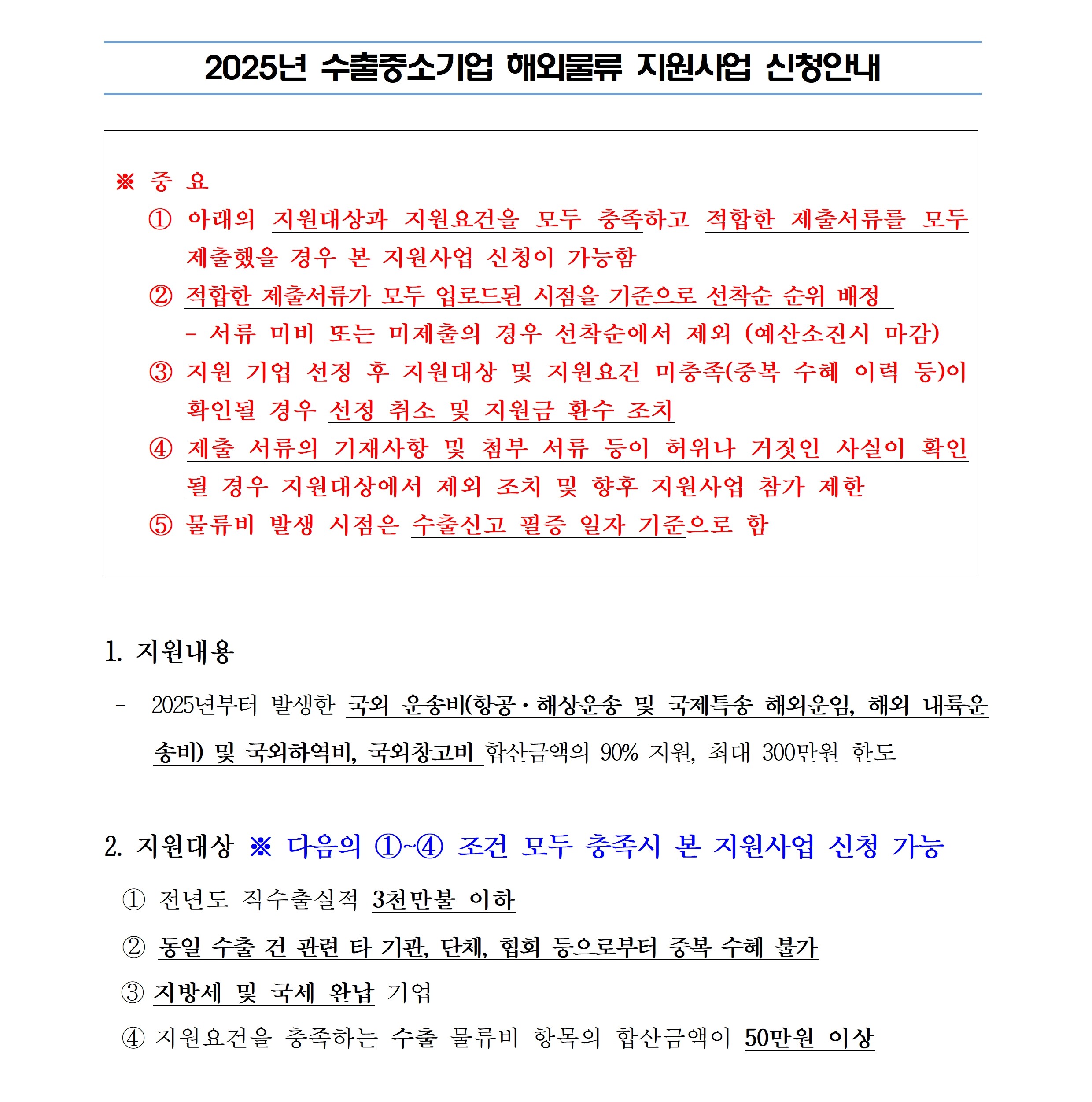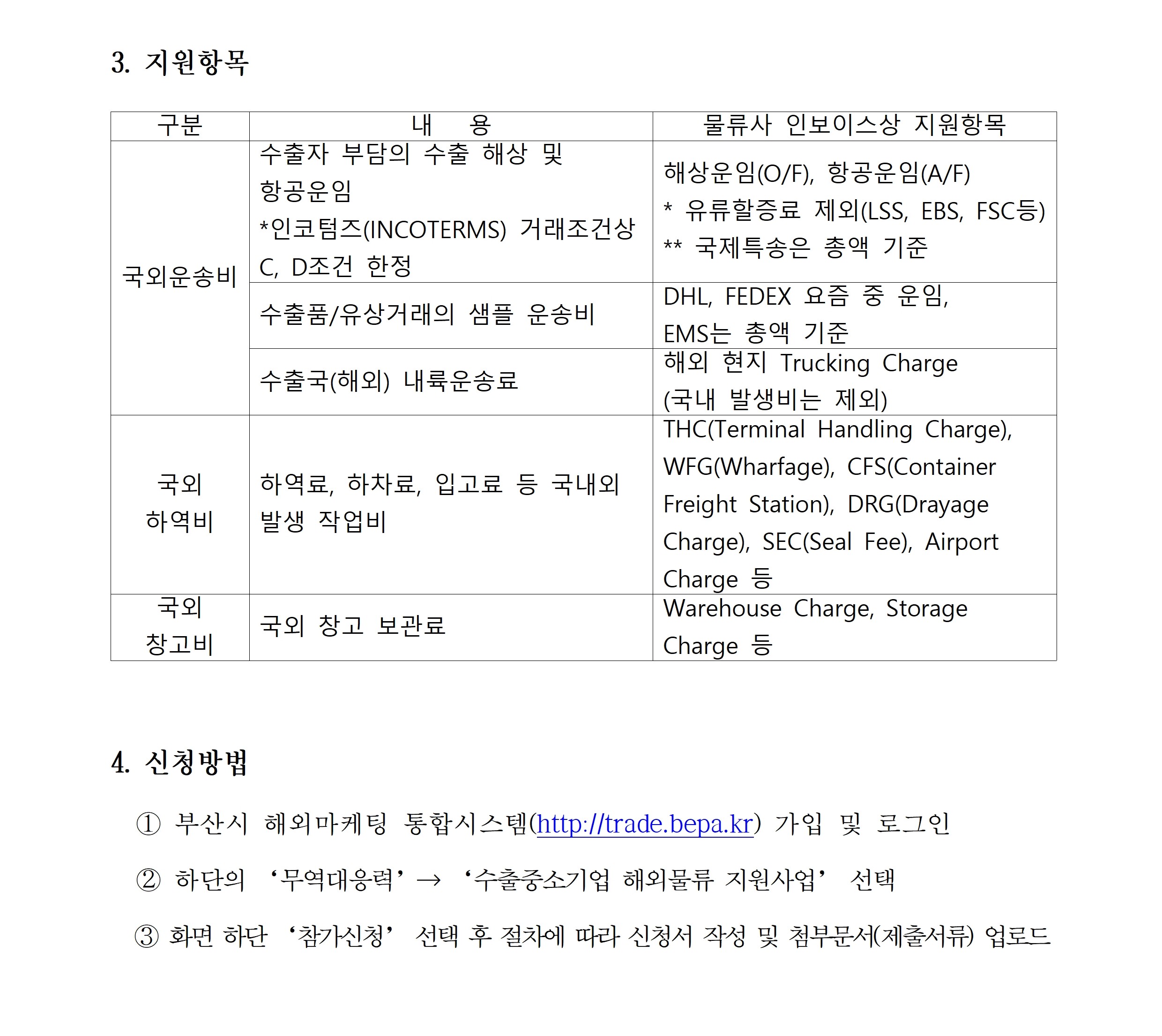 ㅇ 지원항목 확대 : 해외내륙운송비, 국외 하역비 및 창고비 포함