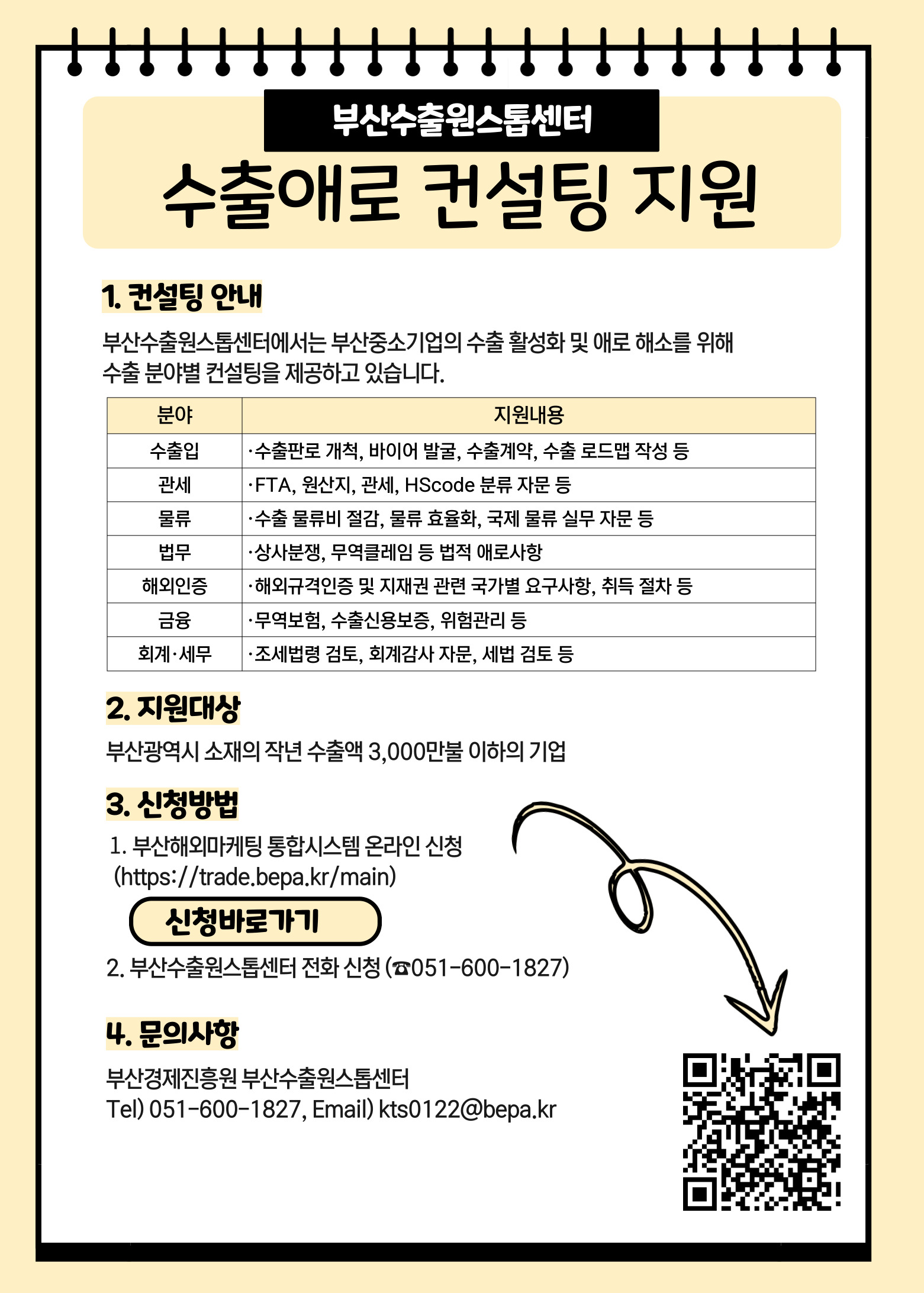 3. 지원대상 : 부산소재의 수출애로사항을 보유한 기업 중 전년도 수출액이 3,000만불 이하인 기업
