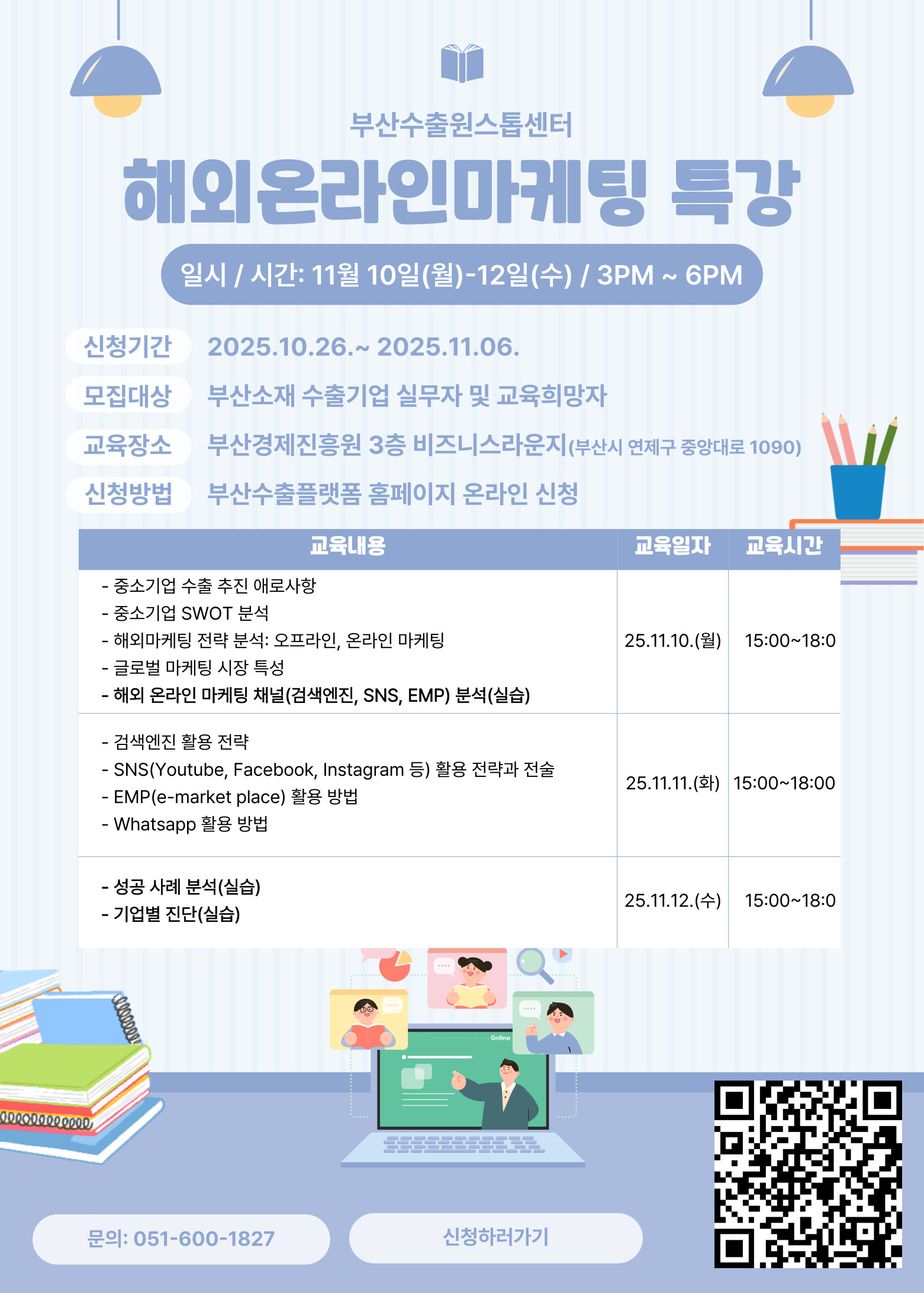 - 해외온라인 마케팅 특강(2일차) : 2025.11.11.(화) 15:00~18:00(3시간)